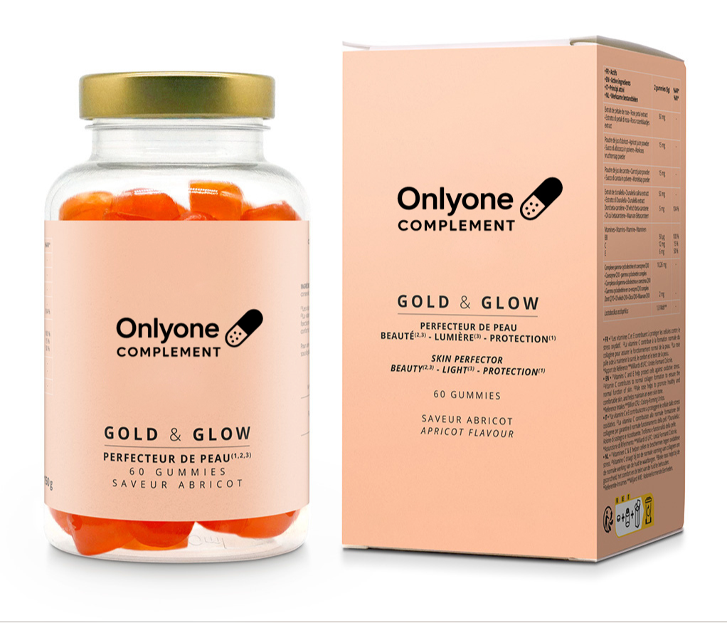 Bulking agent: maltitol syrup; Water; Gelling agent: fruit pectin; Acidifier: citric acid; Dunaliella thallus extract (Dunaliella salina); Pale rose petal extract (Rosa centifolia L.); Natural apricot flavor; Acid regulator: sodium citrate; Vitamin E (D-alpha-tocopherol acetate); Vitamin C (ascorbic acid); Apricot fruit juice powder (Prunus armeniaca L.); Carrot root juice powder (Daucus carota); Gamma-cyclodextrin and coenzyme Q10 complex; Probiotic: Lactobacillus acidophilus; Coating agents: carnauba wax (Carnauba cera L.) and sunflower oil (Helianthus Oleum L.); Vitamin B8 (biotin)